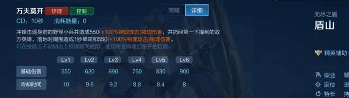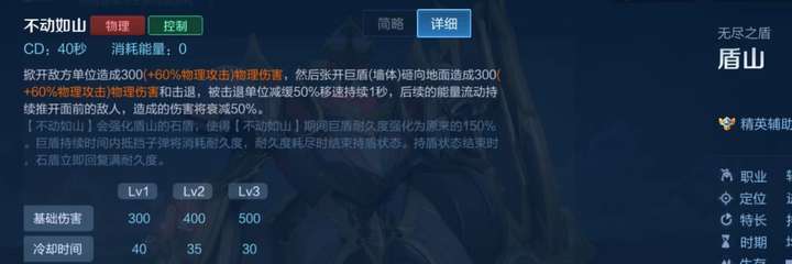 他的三技能不動如山,張開巨盾砸向地面,對敵人造成擊退和減速效果,起到了隔絕戰場的作用。
