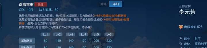 李元芳的一技能諜影重重,對敵方目標進行暗印標記,普攻打出4層印記,產生爆炸傷害,推塔速度主要是在4分鐘之后更加明顯。