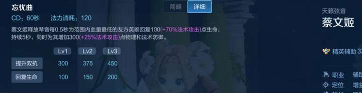 她的三技能忘憂曲,可以為范圍內血量最低的友方英雄回復持續5秒的生命和增加物理和法術防御。