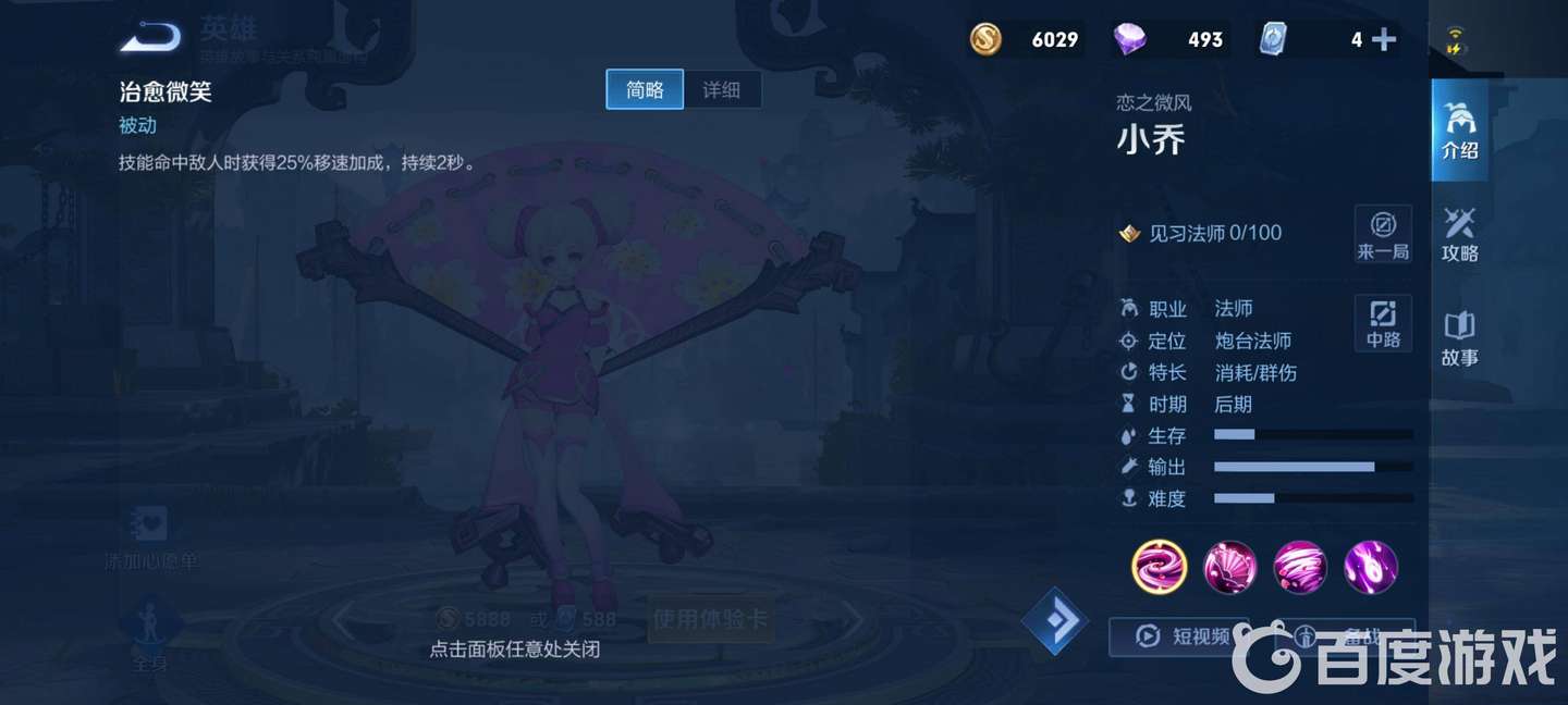 3、技能介紹 ①一技能:綻放之舞。一技能綻放之舞是小喬的主力輸出技能,一個遠距離的直線aoe傷害技能,冷卻固定5秒能夠頻繁釋放。法力消耗是60在前期對線沒有藍buff的情況下還是要合理使用的。因為一技能的回旋特性使得攻擊一個目標時往往是能擊中兩次,一技能有傷害衰減機制,所以攻擊敵人最好不要隔著兵線。而且我們可以看到一技能的基礎加成是十分高的,滿級高達735這也說明了即使小喬出一定的生存裝備一技能仍然能打出高傷害。