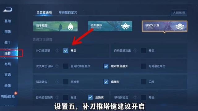 設(shè)置5.補(bǔ)刀推塔鍵建議開啟,這樣我們在攻擊小兵和敵方英雄的時候,點擊補(bǔ)兵鍵,就可以優(yōu)先搶線和補(bǔ)刀,還可以在攻擊防御塔和敵方英雄的時候,點擊推塔鍵,就可以優(yōu)先推塔!