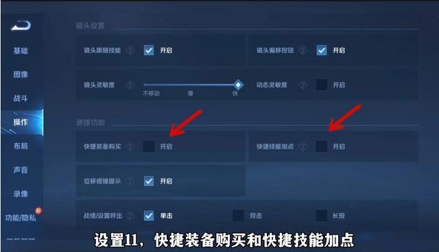 設(shè)置11.快捷裝備購買和快捷技能加點,這兩個都建議不勾選,這樣在沒來得及買裝備和加點的時候,系統(tǒng)就不會自動買裝和加點!