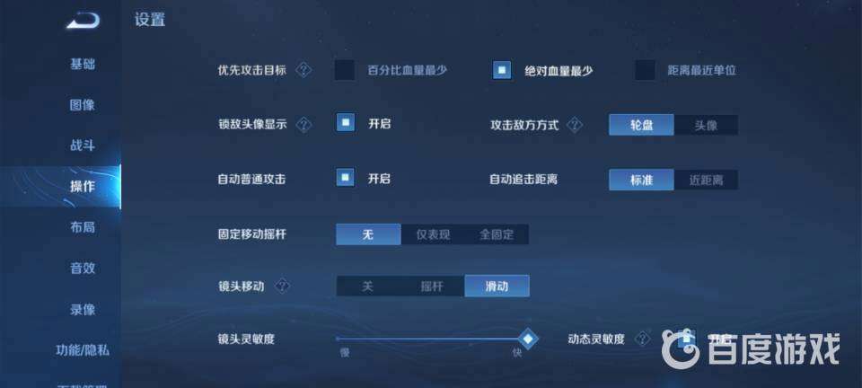 2、選擇優(yōu)先攻擊目標(biāo):絕對血量最少,開啟鎖敵頭顯示,攻擊敵方方式為輪盤,開啟自動普通攻擊,鏡頭敏銳度調(diào)到最快