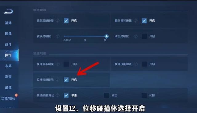 設(shè)置12.位移碰撞提選擇開啟,這樣當(dāng)英雄用技能位移的時候,可以看到墻體外有明顯的落點提示,有助于我們穿墻,適合所有英雄設(shè)置開啟!
