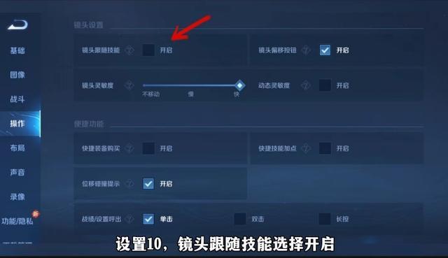設(shè)置10.鏡頭跟隨技能選擇開啟,用技能瞄準(zhǔn)時,如果技能超出屏幕范圍,技能就會隨技能方向偏移,特別適合虞姬,墨子這種技能攻擊距離比較遠(yuǎn)的英雄,還有鏡頭偏移按鈕選擇開啟,拖動按鈕就可以查看更遠(yuǎn)處的視野,再次點擊就會恢復(fù)默認(rèn)視角,這個設(shè)置所有英雄適合開啟!