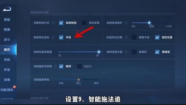 設(shè)置9.智能施法追蹤選擇開啟,并且關(guān)閉長按顯示描述,特別適合像安琪拉,小喬,鐘馗這種,需要用技能瞄準(zhǔn)的英雄,長按技能就可以實現(xiàn)技能自動鎖敵追擊,能大大提高技能命中率!