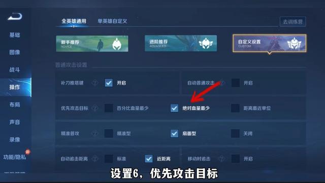 設(shè)置6.優(yōu)先攻擊目標(biāo)選擇絕對血量最少,這樣在攻擊多個敵方英雄的時候,就會優(yōu)先攻擊絕對血量少的脆皮,并且可以把鎖敵頭像顯示打開,這樣技能上方會出現(xiàn)一排敵方英雄頭像,在目標(biāo)太多的時候,就可以點擊英雄頭像,來進(jìn)行精準(zhǔn)攻擊!
