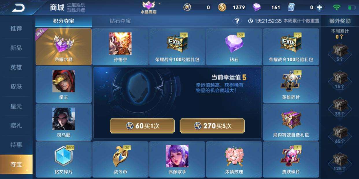 在商城的最下角便是奪寶界面,而奪寶也分為兩種,一種是積分奪寶,另一種便是鉆石奪寶。