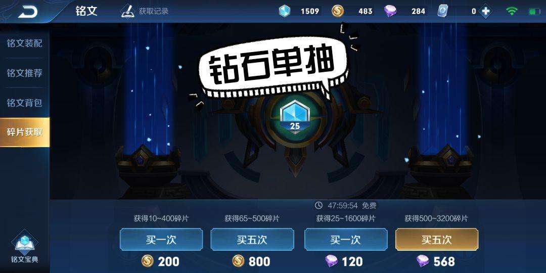 在左下角的銘文界面中,點擊碎片獲取,我們即可進行抽獎,而抽獎也分為兩種方式,分別為鉆石抽獎、金幣抽獎。
