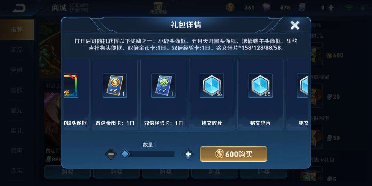 例如最近出的頭像框金幣購買活動,600金幣開頭像框的箱子,而箱子中有著豐富的銘文碎片,基本600金幣開的都是銘文碎片,而且都只有幾十,血虧。