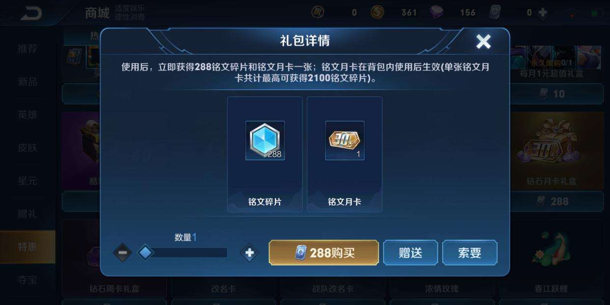 月卡禮盒需要288點券,使用后便可立即獲得288銘文碎片,并且一個月最高可獲得2100銘文碎片,也就是一共最高可獲得2388的銘文碎片。