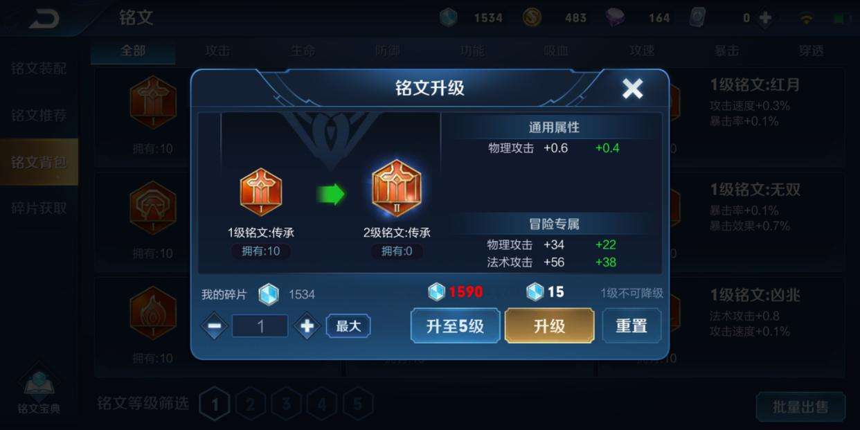 對于想快速升級銘文的小伙伴們來說,可以快速的使用金錢的魔力達到150級,如果買700點券的箱子,大約保底需要21000的點券便可湊齊一套5級銘文,也就是保底2100元出一套。