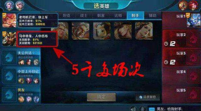 很多玩家在排位選擇英雄的時候都會秀一下自己的英雄使用場次,就像上面這位玩家,關羽英雄已經玩了5215場,這僅是一個英雄而已,如果加上他其他英雄場次的話,那估計至少有上萬場了吧。