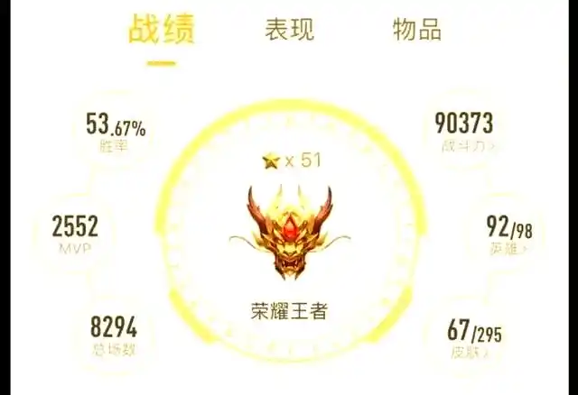 高段位,低水平。例如,我們觀察到一位玩家,其榮耀王者51星的成就令人矚目,通常會被視為大神級玩家。然而,深入分析后發現,其個人戰力僅為九萬多分,且勝率較低,僅為50%出頭。盡管該玩家未透露本賽季的具體場次,但僅從戰斗力和勝率推測,其達到榮耀王者所花費的場次必定不菲,顯然是依賴場次累積而非真實實力。