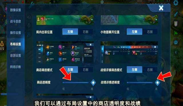 再來看布局設置中的其他選項。在日常游戲中,調整商店透明度和戰績詳情透明度,能夠有效防止裝備或戰績界面遮擋視線。尤其是在選擇裝備時,稍有不慎就可能面臨危險。然而,這個問題有一個簡單的解決方法——調整布局設置中的商店透明度和戰績詳情透明度。只需將透明度滑塊拉到最低,你便能更清晰地觀察英雄狀態,同時也不會被裝備或戰績界面干擾視線。