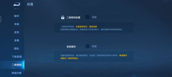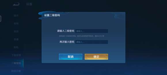進入游戲大廳:打開王者榮耀手游,進入游戲大廳界面。找到設置選項:在游戲大廳的右上角,點擊“設置”圖標。進入二級密碼設置:在設置界面中,下滑找到“二級密碼”選項,并點擊進入。開啟二級密碼:在二級密碼設置界面,勾選“二級密碼設置”右側的復選框,以開啟二級密碼功能。設置密碼:進入設置二級密碼界面,按照提示輸入二級密碼,并再次輸入密碼進行確認。最后,點擊“確定”按鈕完成設置。