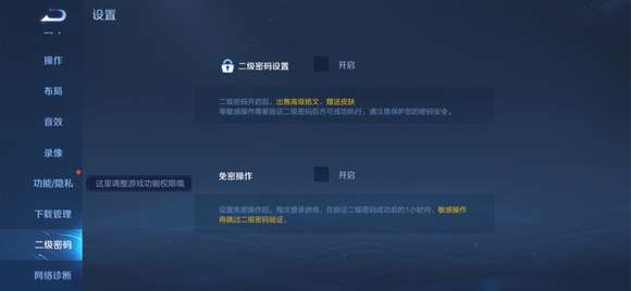 進入游戲大廳:打開王者榮耀手游,進入游戲大廳界面。找到設置選項:在游戲大廳的右上角,點擊“設置”圖標。進入二級密碼設置:在設置界面中,下滑找到“二級密碼”選項,并點擊進入。開啟二級密碼:在二級密碼設置界面,勾選“二級密碼設置”右側的復選框,以開啟二級密碼功能。設置密碼:進入設置二級密碼界面,按照提示輸入二級密碼,并再次輸入密碼進行確認。最后,點擊“確定”按鈕完成設置。