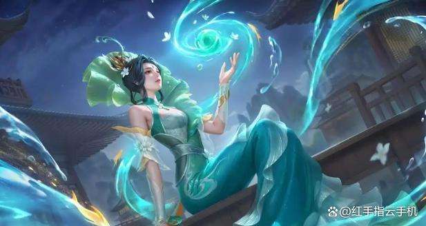 甄姬 - 逆浪荇歌:勇者限定,通過 S40 賽季之旅任務獲取,技能特效以青綠色為主,含白玉荇菜、水流漣漪元素。