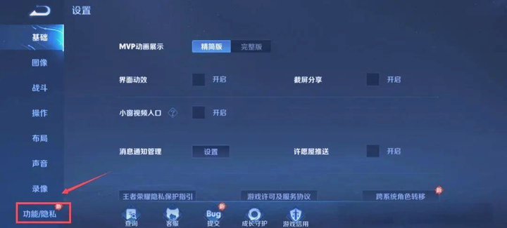 2、在設(shè)置界面中,找到并點(diǎn)擊“功能/隱私”選項(xiàng)。這個(gè)選項(xiàng)通常位于設(shè)置菜單的某個(gè)位置,用于調(diào)整游戲中的隱私和功能設(shè)置。