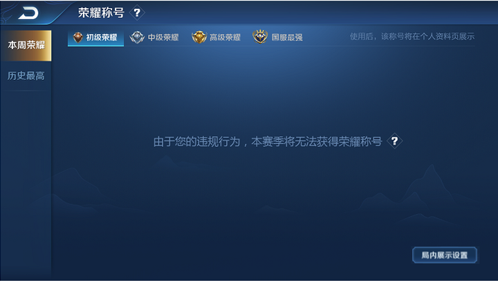 局內優先展示設置 在【本周榮耀】-【榮耀稱號展示設置】界面可以選擇是否優先在局內展示榮耀稱號 局內展示榮耀稱號的條件與展示榮譽徽章條件一致,但須使用本周獲得了榮耀稱號的英雄,否則仍然會展示榮譽徽章。