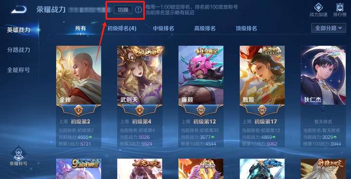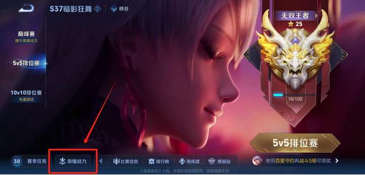 2. 找到榮耀記錄:在排位界面中點擊下方的“榮耀戰力”,會出現下拉隱藏菜單,點擊其中的“榮耀戰區”。