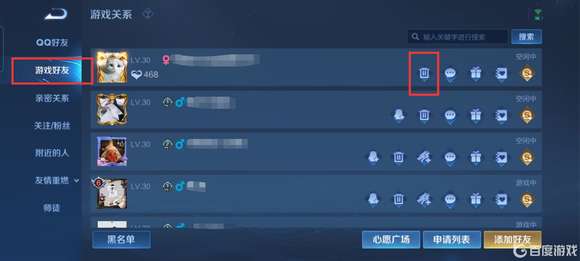 2、點擊游戲好友,在點擊好友旁邊的垃圾桶按鈕。
