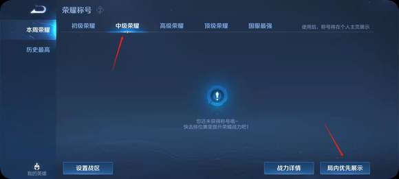 2、玩家將榮譽稱號顯示打開,然后自己的榮耀戰力達到初級后,即可獲得初級榮耀稱號并顯示。