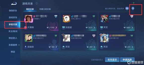 2、點擊親密關系,在點擊右上方的設置按鈕。