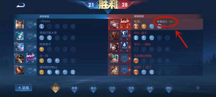 打完對(duì)局,點(diǎn)擊右下角數(shù)據(jù),然后就會(huì)出現(xiàn)下面7個(gè)數(shù)據(jù),一般都會(huì)默認(rèn)出現(xiàn)第二個(gè)英雄數(shù)據(jù),自己選擇左邊第一個(gè)表現(xiàn),箭頭圈圈處就是排位表現(xiàn)分戰(zhàn)力加成,點(diǎn)進(jìn)去就能看到自己目前的戰(zhàn)力。