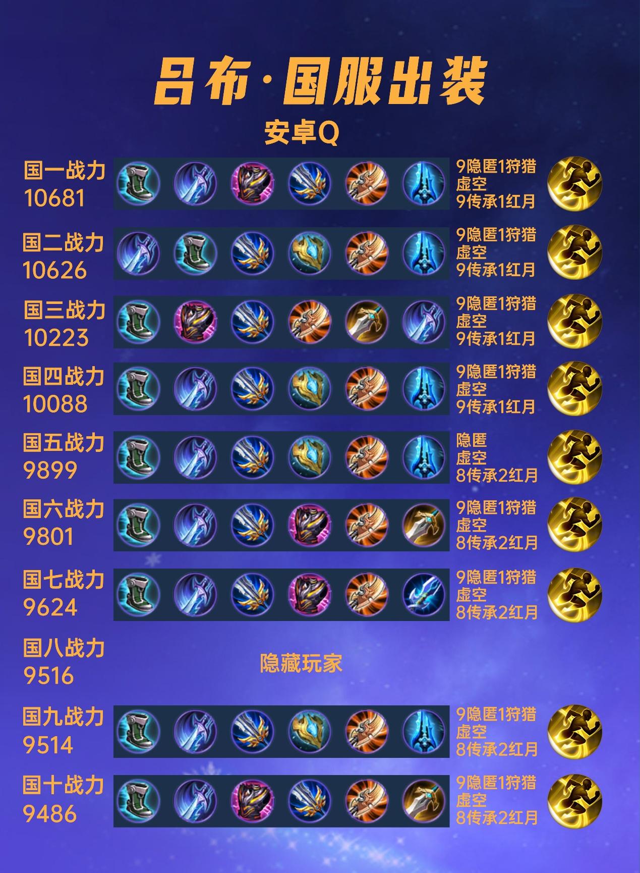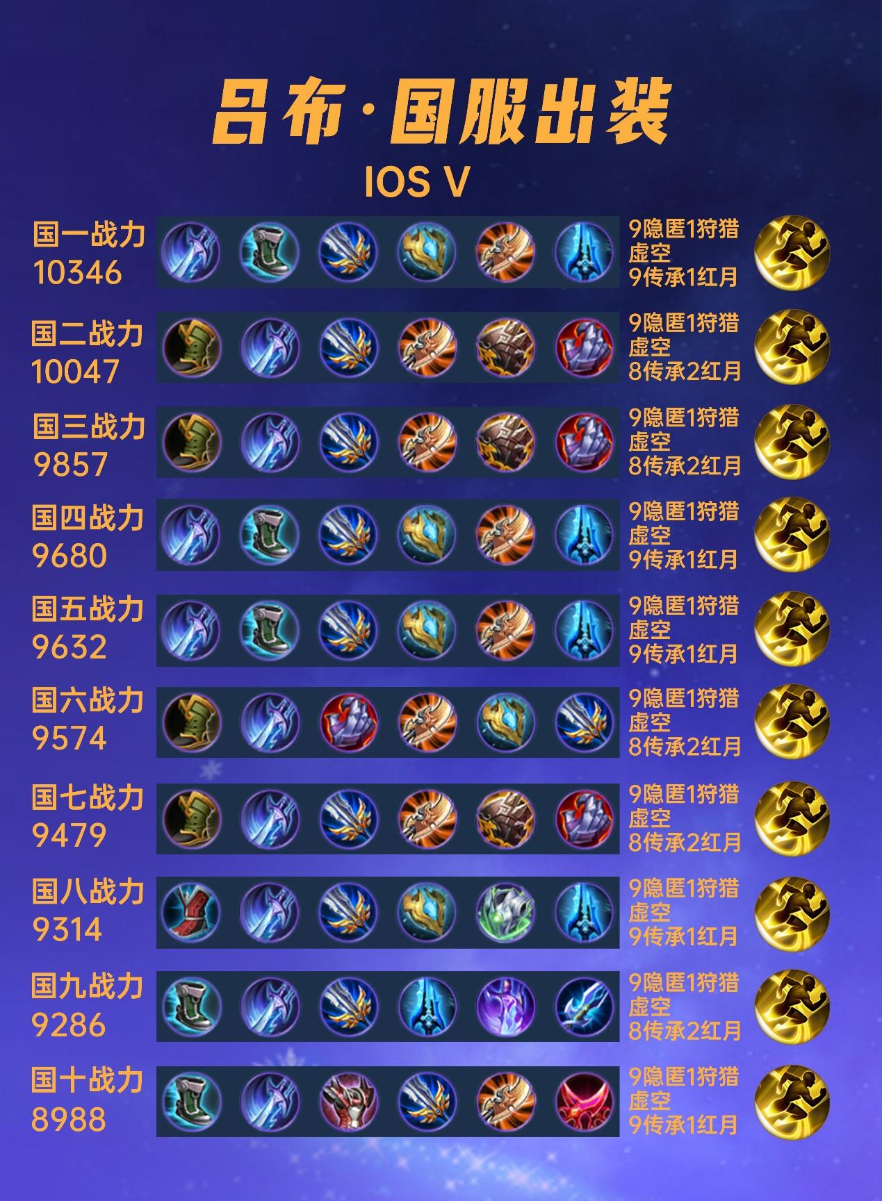 解析:傳承和隱匿提升前期攻擊和移速,讓呂布對線不弱勢;紅月和狩獵補足攻速,普攻更流暢;虛空增加血量和冷卻,提升生存和技能釋放頻率,完美適配 “藍刀不死流”!