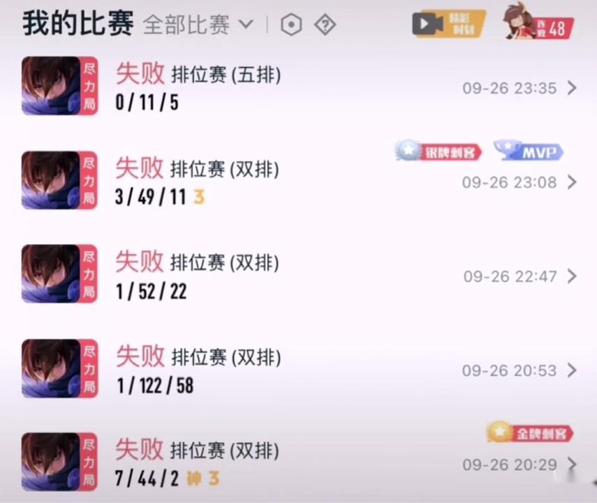 仔細(xì)看戰(zhàn)績,單場(chǎng)陣亡122次還不算離譜,3-49的戰(zhàn)績居然拿到了銀牌?而且還是三殺,還拿到了敗方MVP,另外一場(chǎng)7-44的游戲中,居然是七連殺超神,拿到金牌刺客稱號(hào),這樣的戰(zhàn)績實(shí)屬離譜,而且也讓人感到懷疑。