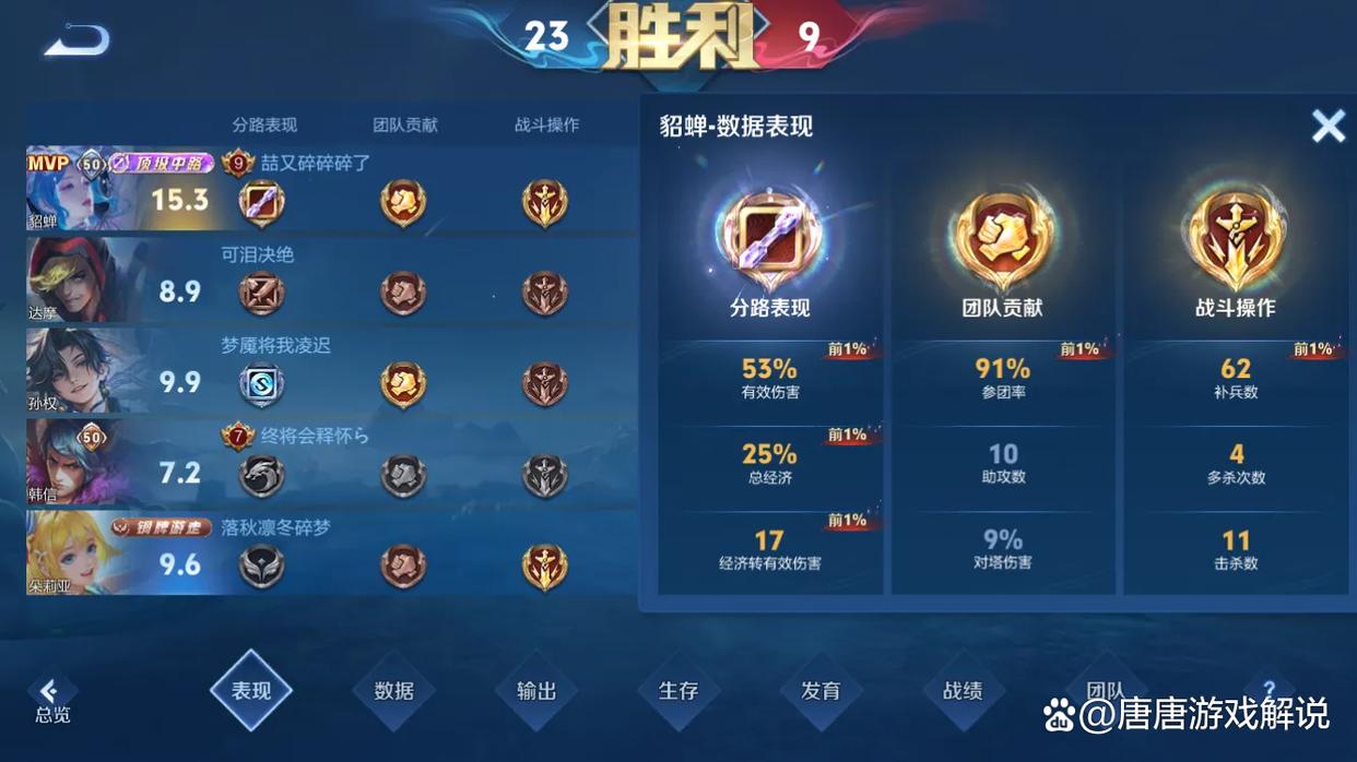 這把用貂蟬獲得15.3評分頂級中路的對局,達到金色評級的表現有7條,而排名前1%的數據高達5條,傷害數值和參團率太亮眼了。